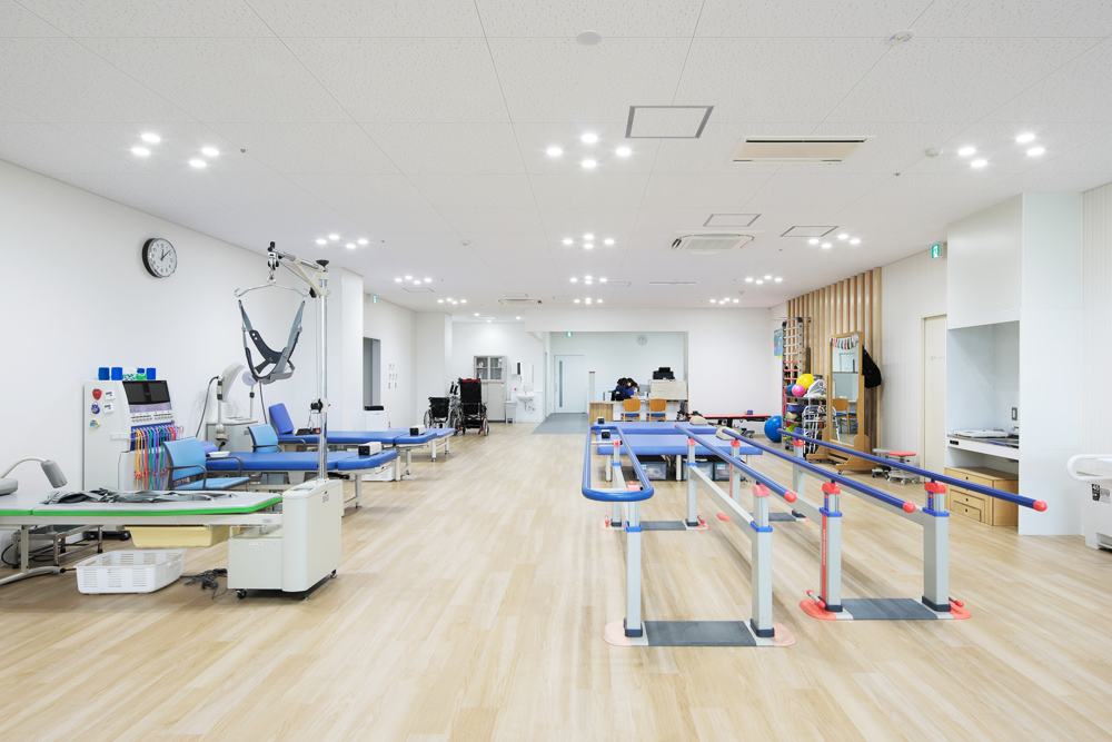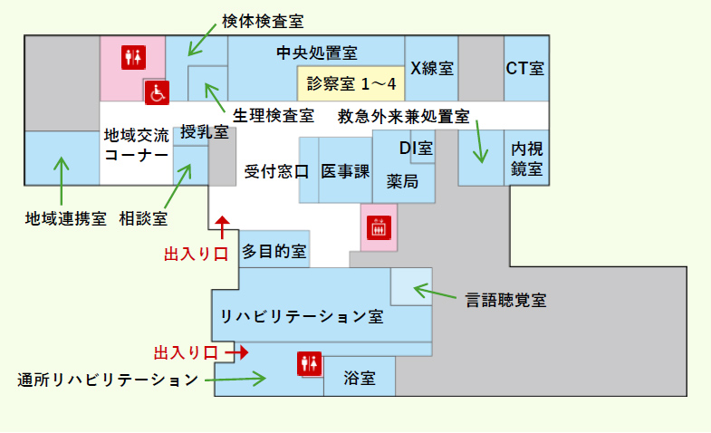 診察室/検査室(検体・生理)/処置室/X線室/CT室/地域連携室/地域交流コーナー/相談室/医事課(受付窓口)/薬局/DI室/救急外来兼処置室/内視鏡室/多目的室/リハビリテーション室/言語聴覚室/通所リハビリ/浴室