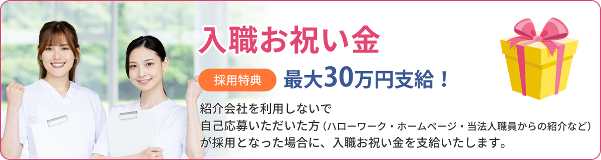紹介会社等を使用しない自己応募(ハローワークやホームページ)いただいた方、(当法人職員からの紹介含む)が採用となった場合に入職お祝い金を支給いたします。